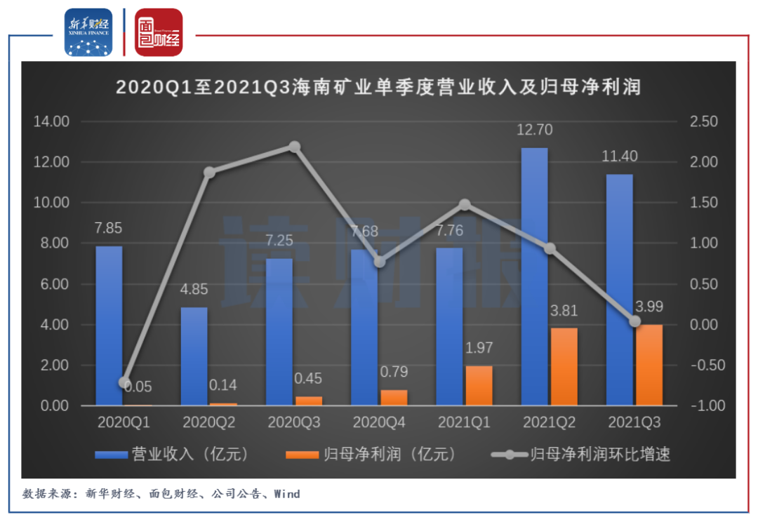 業(yè)績的大幅增長是海南礦業(yè)股價上漲的有力支撐。2021年前三季度,公司實(shí)現(xiàn)營業(yè)收入31.85億元,同比增長59.6%;實(shí)現(xiàn)歸母凈利潤9.78億元,大幅增長逾14倍;扣除非經(jīng)常損益的歸母凈利潤為6.75億元,同比增長逾5倍,非經(jīng)常損益主要系公司所持交易性金融資產(chǎn)市值上升導(dǎo)致的公允價值變動收益及處置股票產(chǎn)生投資收益。