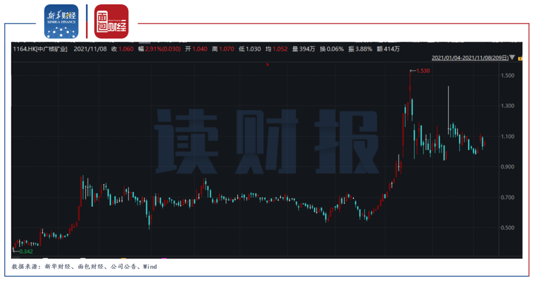 海南礦業(yè)早在2016年11月與中廣核礦業(yè)簽署認(rèn)購協(xié)議,通過全資子公司香港鑫茂投資認(rèn)購中廣核礦業(yè)增發(fā)的6.59億股股票,每股價格0.52港元。中廣核礦業(yè)的母公司為中國廣東核電集團(tuán),主要業(yè)務(wù)為天然鈾貿(mào)易、物業(yè)投資及其他投資。2021年年初至今,中廣核礦業(yè)股價大幅上漲,截至11月8日收盤,中廣核礦業(yè)股價收報1.06港元/股,期間累計漲幅近200%。