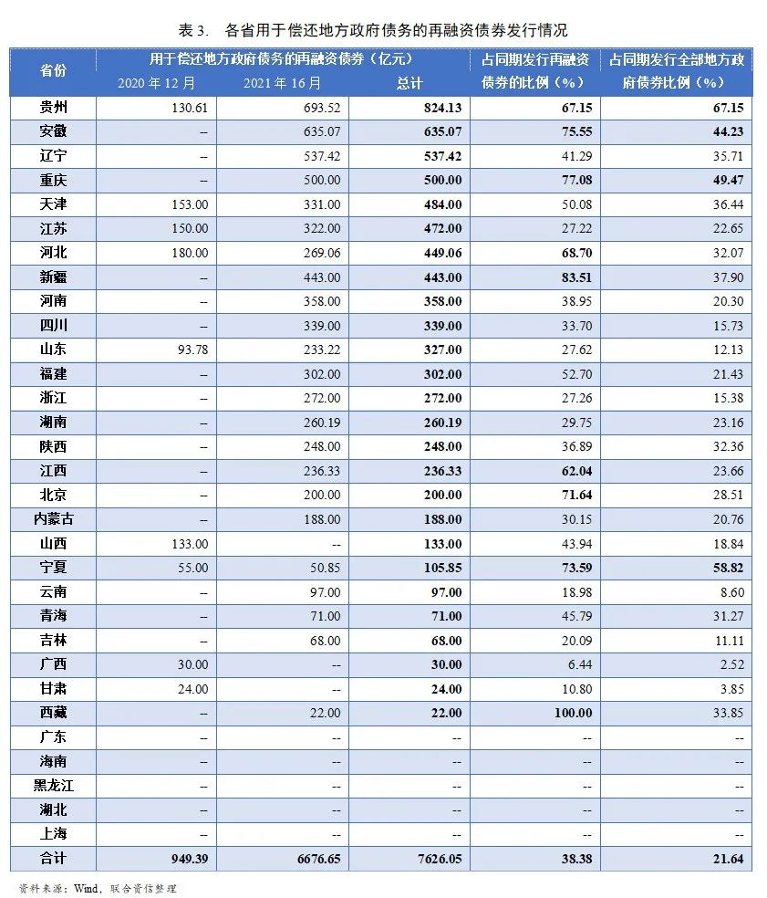 截至2021年6月末,貴州發(fā)行用于償還地方政府債務再融資債券的規(guī)模最大,高達824.13億元,占該省同期(2020年12月及2021年上半年)發(fā)行再融資債券的比例為67.15%,占該省期間發(fā)行全部地方政府債券的67.15%。安徽、遼寧、重慶、天津、江蘇、河北、新疆等省份發(fā)行規(guī)模亦不小,均在400億元以上。