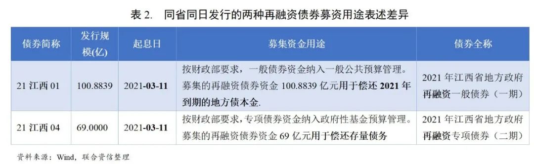 之所以采用再融資債券助力償還地方政府隱性債務,或主要由于融資債券用途具備靈活調整的可能性。在當前的地方政府債券制度框架下,新增債券及置換債券用于化解現期債務均面臨一定操作上的約束。新增債券方面,新增債券是“新增”的地方政府債務,且由于新增一般債券受到預算赤字的約束,每年新增規(guī)模很小,如2021年我國預算安排新增地方政府債務限額4.47萬億元,其中一般債務限額僅0.82萬億元,專項債務限額3.65萬億元,新增專項債券規(guī)模雖然較多但其募集資金需受限用于新開工項目。置換債券是用于償還清理甄別認定的截至2014年末全部非政府債券形式存量政府債務。因此,新增債券及置換債券均面臨一定操作上的約束。而再融資債券主要強調債務滾續(xù)的作用,募集資金用途具備一定靈活調整的可能性。