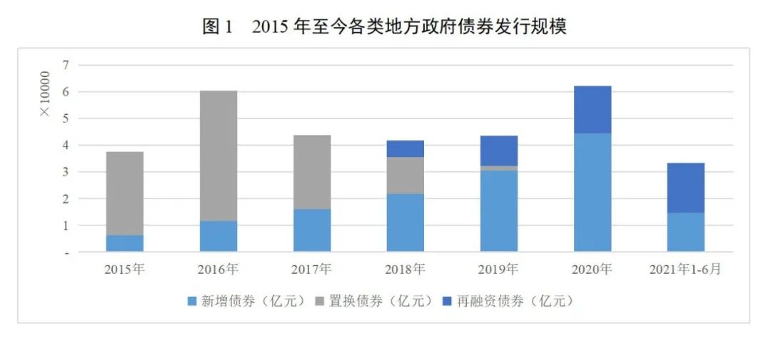按照前期化解地方政府存量債務的安排,2015至2017年發(fā)行的地方債中以置換債券為主,2018年新增債發(fā)行規(guī)模超過置換債券和再融資債券規(guī)模;2019年至2020年,地方政府債中主要是新增債券;2021年上半年,再融資債券發(fā)行規(guī)模較大。