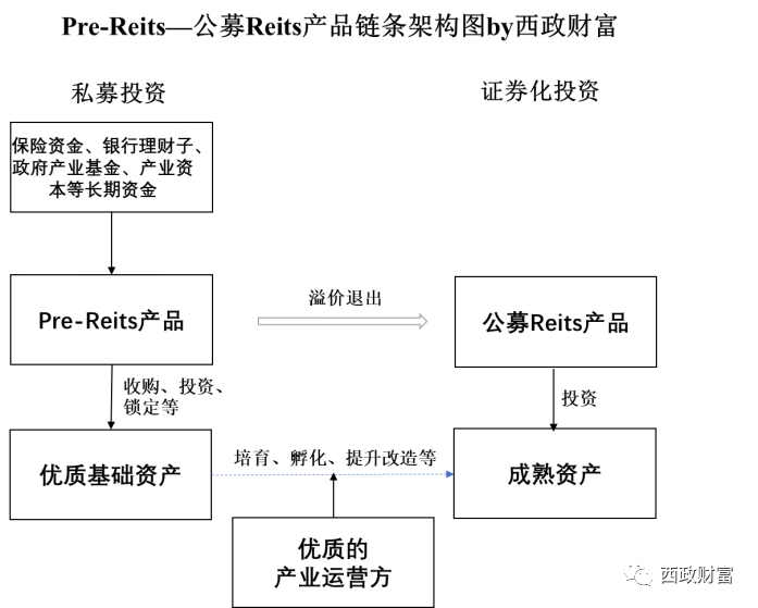 在上述架構(gòu)中,Pre-Reits聯(lián)合諸如保險資金、銀行理財子資金、政府產(chǎn)業(yè)投資基金、產(chǎn)業(yè)資本等長期資金共同成立Pre-Reits私募股權(quán)投資基金,在一級市場提前鎖定優(yōu)質(zhì)資產(chǎn)(產(chǎn)業(yè)運(yùn)營方若有優(yōu)質(zhì)的基礎(chǔ)資產(chǎn),亦可納入相關(guān)的資產(chǎn)池),資金用于優(yōu)質(zhì)項目的新建或存量優(yōu)質(zhì)項目的收購,并綁定產(chǎn)業(yè)運(yùn)營方深度合作。產(chǎn)業(yè)運(yùn)營方通過將基礎(chǔ)資產(chǎn)培育、孵化、提升改造成為成熟資產(chǎn),在資產(chǎn)達(dá)到發(fā)行標(biāo)準(zhǔn)后,將項目資產(chǎn)打包為資產(chǎn)支持專項計劃并出售給Reits,并獲取一級市場股權(quán)投資及二級資本市場溢價退出的高額投資回報。
