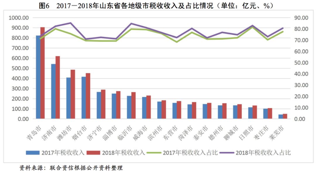 山東省各地級市稅收收入占一般公共預(yù)算收入的比重均在70%以上,一般公共預(yù)算收入質(zhì)量較好,其中,濰坊市稅收占比高達85.17%,臨沂市緊隨其后為84.67%。對比2017年來看,山東省各地級市稅收占比均實現(xiàn)了增長,其中濰坊市有較大增幅,泰安市、威海市、日照市、濱州市和煙臺市增幅較小。