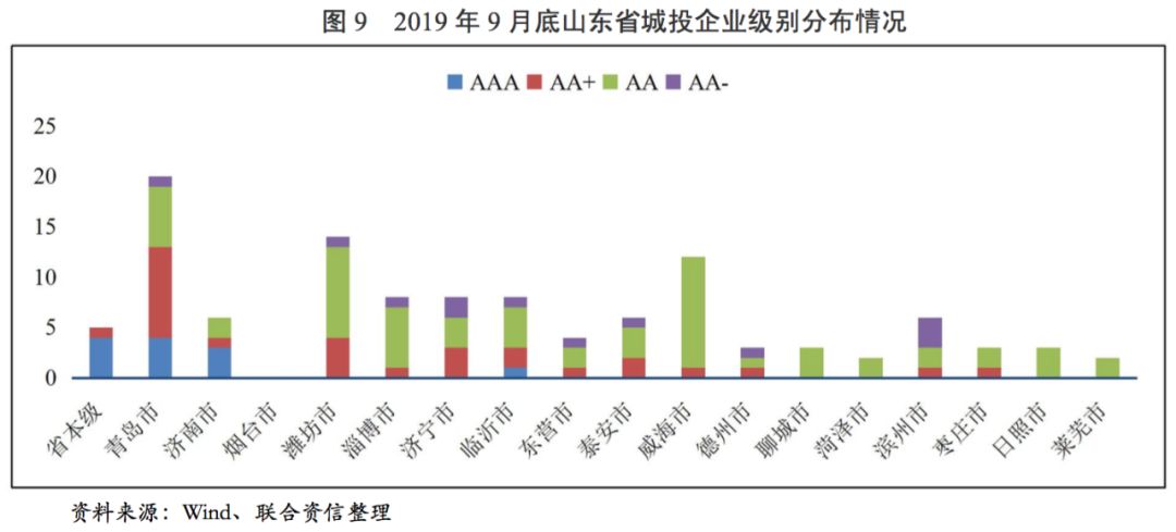 截至2019年9月底,山東省有存續(xù)債且有主體級別的城投企業(yè)共112家[6]。其中,省本級城投企業(yè)5家,地級市本級城投企業(yè)26家,地級市下轄區(qū)級城投企業(yè)30家,園區(qū)城投企業(yè)13家,縣級市/縣城投企業(yè)38家;主體級別為AAA的城投企業(yè)12家,主體級別為AA+的城投企業(yè)27家,主體級別為AA的城投企業(yè)61家,主體級別為AA-的城投企業(yè)12家。分地級市來看,青島市的城投企業(yè)個數(shù)最多,達到20家,其次為濰坊市(14家)、威海市(12家)、臨沂市(8家)、淄博市(8家)、濟寧市(8家)、濟南市(6家)和濱州市(6家),其余地級市平臺數(shù)量相對較少。從級別分布看,受區(qū)域經(jīng)濟及財政實力影響,AAA城投企業(yè)主要集中于省本級及經(jīng)濟財政實力強的青島市和濟南市,其余地級市中只有臨沂市有1家AAA城投企業(yè),但臨沂市與其他AAA城投企業(yè)所屬區(qū)域的經(jīng)濟和財政實力的差距較大。除煙臺市、聊城市、菏澤市、日照市和萊蕪市以外,其余地級市均有AA+城投企業(yè),煙臺市無存續(xù)級別的城投企業(yè),聊城市、菏澤市、日照市和萊蕪市城投企業(yè)最高級別為AA,級別為AA-的城投企業(yè)全部位于區(qū)縣、高新區(qū)及經(jīng)開區(qū)。