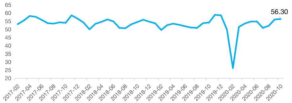 兩只持有中國(guó)物流資產(chǎn)的REITs表現(xiàn)更為優(yōu)越,不但一舉收復(fù)失地更較年初實(shí)現(xiàn)7%漲幅。根據(jù)中國(guó)物流與采購(gòu)聯(lián)合會(huì)數(shù)據(jù)顯示,10月份中國(guó)物流業(yè)景氣指數(shù)為56.3%,較上月回升0.2個(gè)百分點(diǎn),為今年以來(lái)最高。