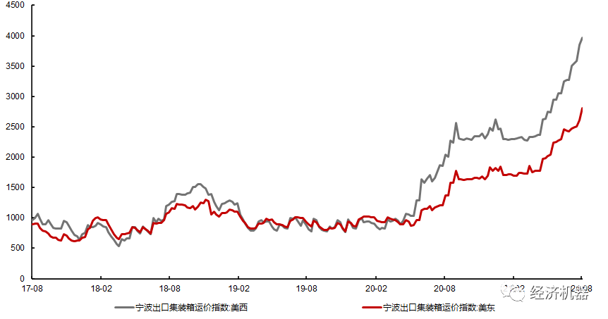 隨著國外主要經濟體經濟的復蘇和疫情的反復,全球進口依舊旺盛,從高頻的集裝箱出口運價指數看,9月寧波出口集裝箱運價指數繼續上行,表明出口依然面臨有力支撐(圖:4)。