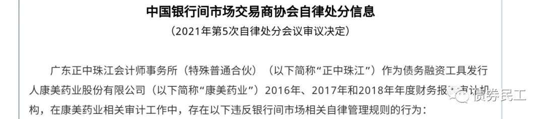 根據(jù)中國銀行間市場交易商協(xié)會的公告信息,因在康美藥業(yè)股份有限公司(以下簡稱“康美藥業(yè)”)2016-2018年度審計(jì)中存在問題,給予廣東正中珠江會計(jì)師事務(wù)所(特殊普通合伙)(以下簡稱正中珠江)自律處分!