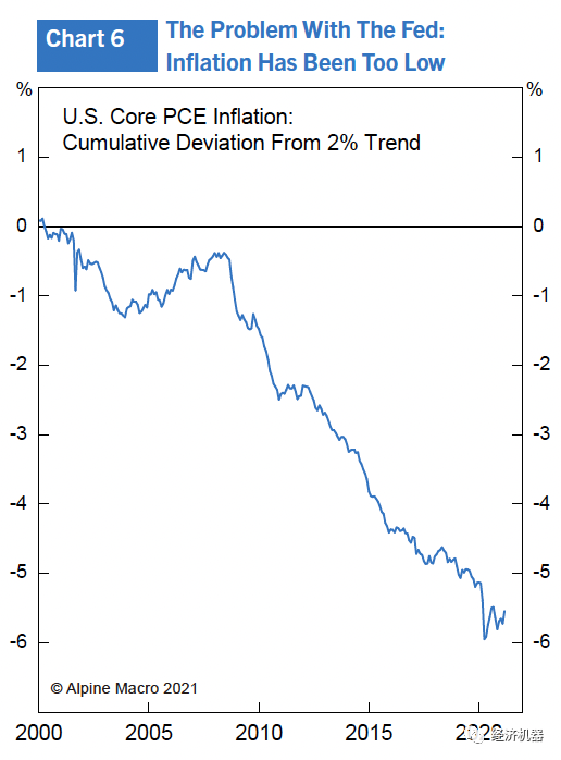 (2) 當(dāng)時制造業(yè)幾乎占美國經(jīng)濟(jì)的四分之一;現(xiàn)在僅為10%。當(dāng)前,世界正進(jìn)入由技術(shù)提供方和使用方共同主導(dǎo)的“第四次工業(yè)革命”,一場完美的技術(shù)創(chuàng)新風(fēng)暴正在形成,并將在未來幾年加速。世界經(jīng)濟(jì)的快速數(shù)字化、機(jī)器人技術(shù)、人工智能和5G通信本質(zhì)上是導(dǎo)向通縮的,這在很大程度上解釋了美聯(lián)儲為什么十多年來未能將通脹率提高到目標(biāo)水平的原因(圖6)。