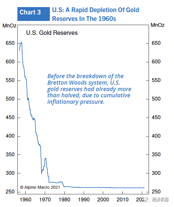 1971年3月布雷頓森林體系的崩潰是1970年代通脹率居高不下并不斷上升的另一個主要結(jié)構(gòu)性原因。自二戰(zhàn)結(jié)束以來,美國一直采用準(zhǔn)金本位制。3然而,金本位制被誤讀了,這常常是一切風(fēng)平浪靜下標(biāo)準(zhǔn)。如果一個國家不遵守規(guī)則僅僅因為它不喜歡被紀(jì)律約束,那么它將失去了維持價格穩(wěn)定的主要功能。