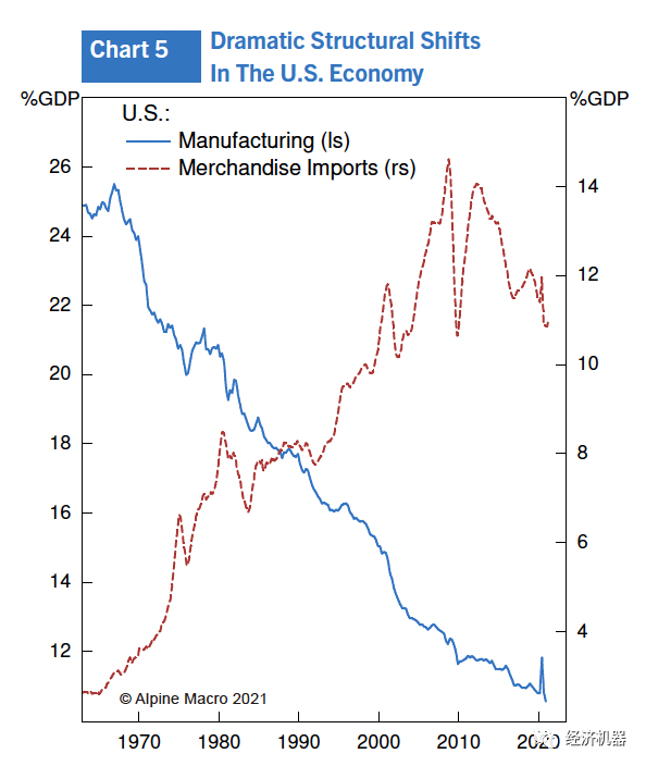 (1) 20世紀(jì)70年代,美國基本上是一個封閉的經(jīng)濟(jì)體。進(jìn)口僅占國內(nèi)生產(chǎn)總值的3.5%。而現(xiàn)在幾乎是當(dāng)時的四倍(圖5)。進(jìn)口是壓力釋放安全閥;當(dāng)出現(xiàn)短缺和價格上漲時,增加進(jìn)口以緩解壓力。在一個封閉的經(jīng)濟(jì)體中,這種情況就很難辦。此外,世界其他地區(qū)的超額儲蓄也相對充裕。這意味著,如果經(jīng)濟(jì)過熱,美國可以很方便地進(jìn)口更便宜的外國儲蓄,以彌補(bǔ)國內(nèi)儲蓄的任何缺口。