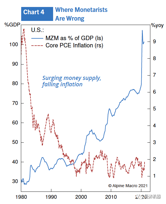 在20世紀(jì)80年代的大部分時間里,貨幣供應(yīng)量(MZM)強(qiáng)勁增長(圖4)。米爾頓·弗里德曼的貨幣主義思想仍然很流行。在整個1980年代,對通脹的擔(dān)憂仍然普遍存在。然而,該模型存在嚴(yán)重缺陷,因為自沃爾克時代以來,貨幣流通速度穩(wěn)步下降,吸收了大部分貨幣供應(yīng)的增長。