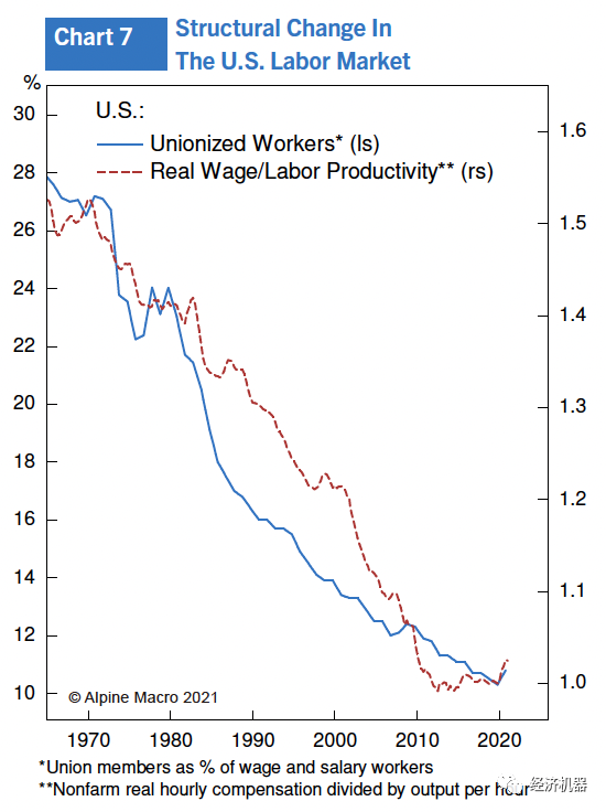 (3) 當(dāng)時加入工會的工人數(shù)量占勞動力的25%,現(xiàn)在約占10%。工會引入剛性工資,同時降低勞動生產(chǎn)率(圖7)。在70年代和80年代,剛性工資是導(dǎo)致勞動力價格螺旋上升的一個關(guān)鍵原因。今天,美國的大多數(shù)工人不僅要相互競爭工作,而且由于全球化的影響,還必須直接或間接地與低工資國家的工人競爭。平均工資率很難持續(xù)超過勞動生產(chǎn)率的水平。