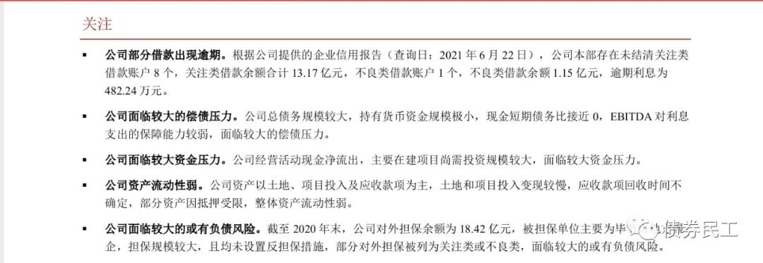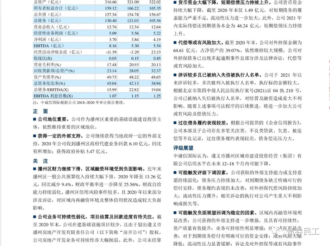 3、遵義市播州區城市建設投資經營(集團)有限公司(以下簡稱“播州建投”)。根據中誠信國際2021年6月29日出具的跟蹤評級報告,播州建投存在多筆關注類、不良貸款、欠息、被追償等不良記錄,且已經被納入失信被執行人名單。播州建投的控股股東為遵義道橋建設(集團)有限公司,播州建投最新主體評級為AA-,評級展望為負面,目前存續債券2只,分別為“17遵義播投債01”(企業債券,債券余額為6.4億元)、“PR播投02”(企業債券,債券余額為5.6億元)。