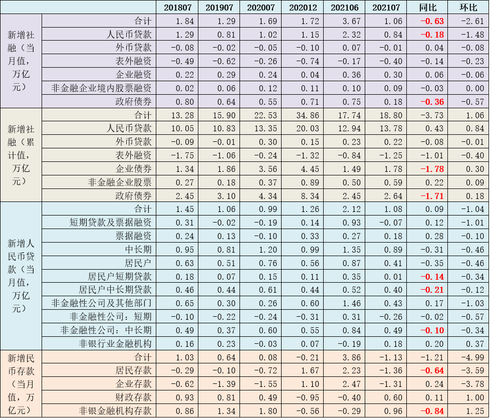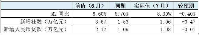2021年8月11日(周三),央行發布7月金融統計數據,新增社融與新增人民幣貸款、M2同比增速均不及預期。2021年7月,新增社會融資規模和新增人民幣貸款分別為1.06萬億和1.08萬億,較預期分別少增0.47萬億和0.01萬億,在近五年的7月新增數據中也明顯處于低位(2017-2020年的7月新增社融分別為2.12萬億、1.84萬億、1.29萬億和1.69萬億)。同時,2021年7月M2同比降至8.30%,較預期值大幅下挫0.40個百分點。