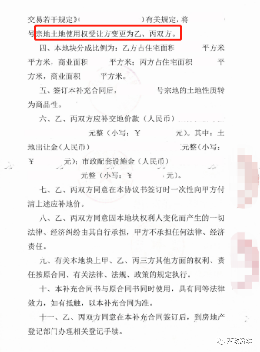 土地整備利益統(tǒng)籌項目的村股份公司留用地合作開發(fā)在雙抬頭的模式下,亦涉及將原屬于村股份公司的留用地變更至村股份公司和開發(fā)商雙方名下的操作,也即由雙方共同持有土地使用權(quán)。目前實務操作一般是規(guī)劃和自然資源部門先跟村股份公司簽訂《土地出讓合同》(村股份公司為受讓人),然后由規(guī)劃和自然資源部門、村股份公司及開發(fā)商三方再簽訂《土地出讓合同補充協(xié)議》,將土地使用權(quán)的受讓人變更為村股份公司和開發(fā)商兩方,由雙方共同持有留用地土地使用權(quán),也即土地證辦理完成后權(quán)屬人是雙主體。具體項目報批報建時,由開發(fā)商和村股份公司一起作為雙主體進行申報,所有對政府的手續(xù)和文件都需要雙方蓋章,包括預售合同也都是雙方蓋章,當然,為避免操作上的繁瑣問題,常見的做法是在預售前村股份公司出具經(jīng)公證的委托書,全權(quán)委托開發(fā)商辦理所有后續(xù)手續(xù)和預售、物業(yè)管理聘請等事宜。物業(yè)分配時,村股份公司和開發(fā)商再按照土地出讓合同和補充協(xié)議約定的分配比例分配物業(yè),下圖為利益統(tǒng)籌項目留用地《土地出讓合同補充協(xié)議》的示例。