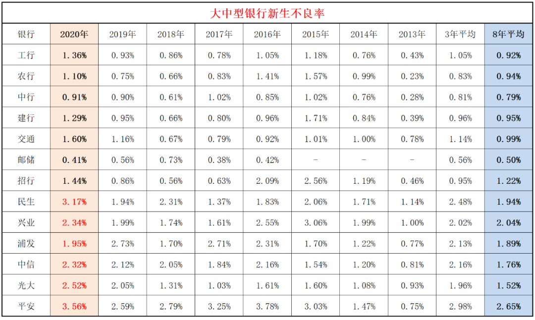 為此,我們統計了13家大中型銀行過去八年新生不良的數據,可以看到: