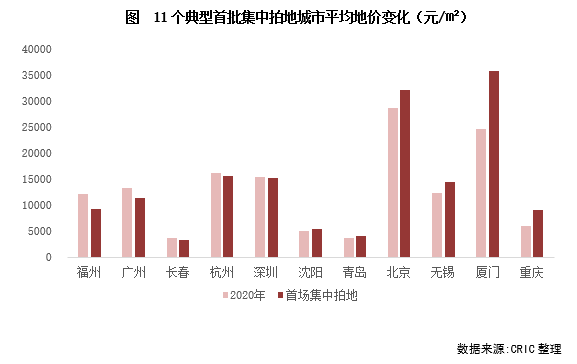 從11個已經(jīng)完成首批集中土拍城市的地價水平來看,和2020年全年涉宅地價格相比,11城中福州、廣州、長春、杭州和深圳成交地價不及去年水平,其余城市地價上漲均十分突出,尤其是重慶,增幅最大,高達(dá)50%,廈門在島內(nèi)兩宗優(yōu)質(zhì)地塊的助力之下,地價也明顯上升,5宗地平均樓板價達(dá)35823元/平方米,超越了一線的北京和深圳。