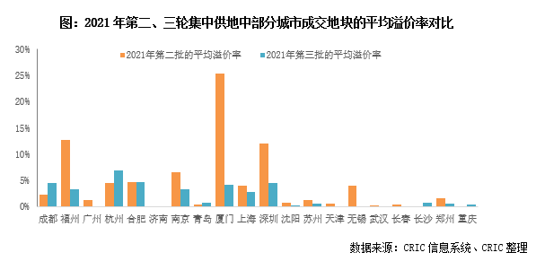 相較于招拍掛,收并購獲得的二手項目歷史遺留問題復雜,面臨諸多風險,對房企整體的投資眼光、盡調和資產評估能力提出較高要求。通常上,收并購作為招拍掛拿地的替代方式,當土拍競爭激烈時,收并購現象可能頻繁。而2021年第二、三輪集中供地溢價率大幅下滑,單項目利潤率相對充足,優質房企對收并購的意愿可能降低,更傾向于獲取土拍市場回報率容易評估的項目。