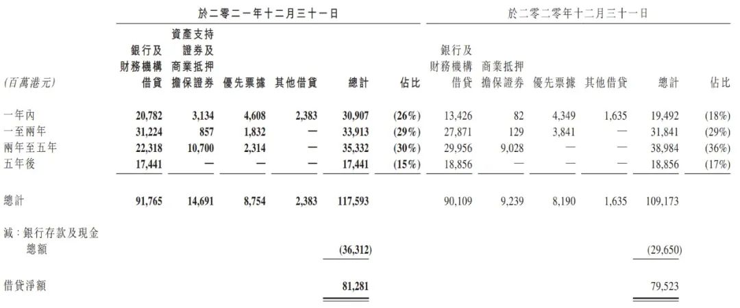 從業績公告里杠桿地產看到,2021年合生創展的流動負債中借貸確實增加了不少,為285.2億港元,同比增幅約59.7%。其中銀行及財務機構借貸、商業抵押擔保證券均增幅明顯。看來合生創展2021年也在努力借錢。