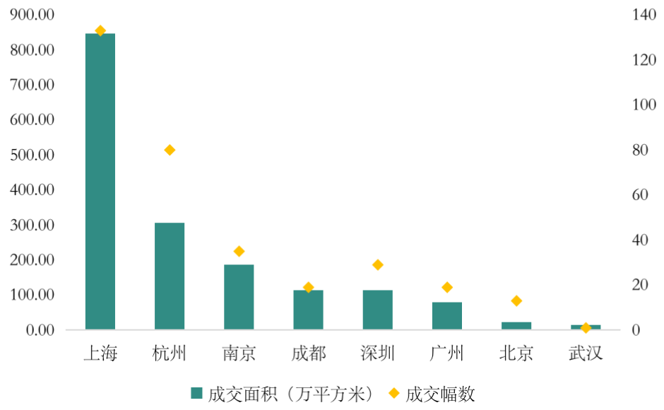 從數(shù)據(jù)可以看出,上海租賃用地?zé)o論是累計(jì)成交面積還是成交幅數(shù)都排全國首位,并遙遙領(lǐng)先于第二、第三位的杭州和南京。