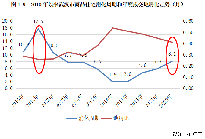 以武漢為例具體來看。2011年底,武漢商品住宅消化周期高達17.7個月,較上一年大幅增長,但同年武漢的地房比較上一年出現下降趨勢,拿地成本較上一年降低,而接下來武漢的庫存壓力逐步減輕,至2015年底消化周期已不足6個月,市場迎來新一輪的大漲機會。2020年時亦是如此,年初受疫情影響武漢市場熱度降至冰點,上半年庫存量也明顯增加,土地市場熱度亦降至低位,拿地成本降低,但隨著下半年市場逐漸恢復,成交熱度上揚,房價也逐步走高,住宅周轉速度也明顯加快。因此,對于這類城市,逆周期布局可迎來更大收益,可重點關注這類機會。