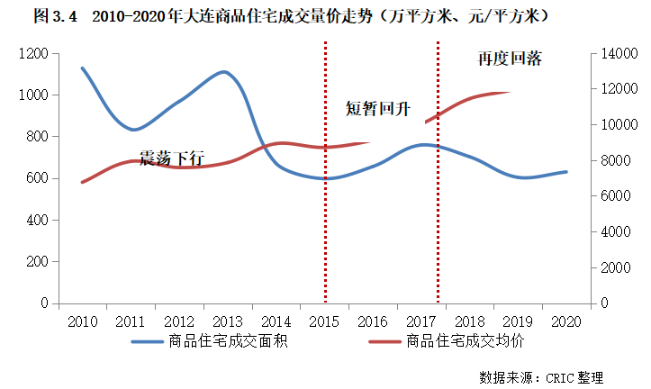 2、大連:規模震蕩下行,市場去化風險凸顯