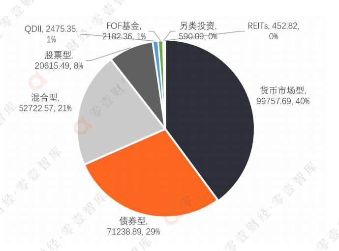 根據Wind數據,在剔除ETF聯接基金投資標的ETF的資產之后,149家有存續基金的管理人截至5月25日的資產凈值合計超過25萬億元,其中99.8%屬于開放式基金。如按類型細分的話,上述超過25萬億元的基金資產,大部分歸屬于固定收益類產品,其中貨幣市場型基金的規模最大。