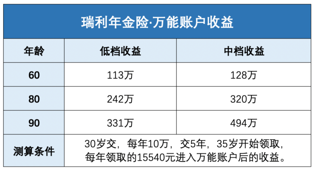 如果老王35歲領(lǐng)取時不著急用錢,把錢放到萬能賬戶二次增值。