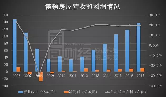 經歷2008年金融危機后,霍頓房屋從2010年開始恢復盈利,而營收則從2012年開始進入增長通道,2017財年總營收為137.42億美元,與2006財年的歷史高點147.61億美元已十分接近。
