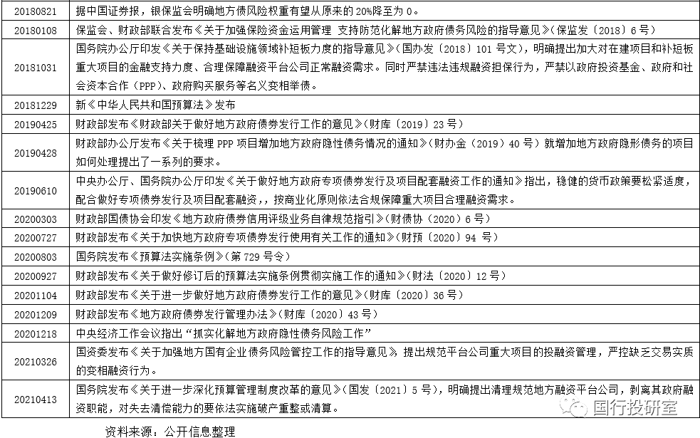 4、2018年8月,國務院發布《關于防范化解地方政府隱性債務風險的意見》(中發〔2018〕27號),要求地方政府通過“統籌資金、償還一批;債務置換、展期一批;項目運營、消化一批;引入資本、轉換一批”等方式在5-10年內化解地方政府隱性債務。