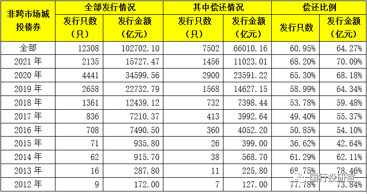 1、截至2021年4月19日,全部12308只未跨市場發行的城投債中,有7502只的資金用途為償還存量債務、占比達到60.95% 這10.27萬億的未跨市場發行的城投債中,有6.60萬億的資金用途為償還存量債務、占比達到64.27%。