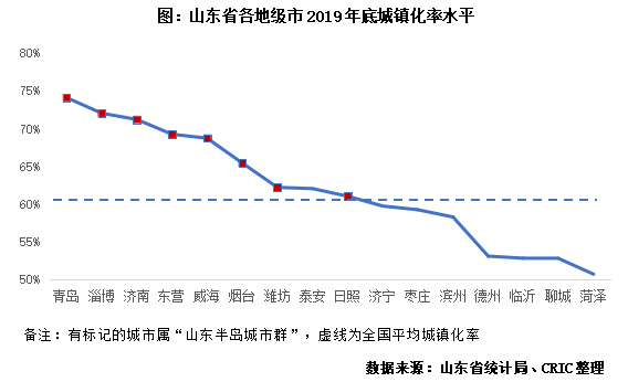 屬“山東半島城市群”的8座城市城鎮(zhèn)化率普遍較高,青島領跑。從城鎮(zhèn)化率來看,截至2019年,全省平均城鎮(zhèn)化率為61.5%,略高于全國60.6%的平均水平。省內城市出現分化,屬“山東半島城市群”(包括濟南、青島、淄博、威海、煙臺、濰坊、日照和東營在內)的8個城市,城鎮(zhèn)化水平均高于全國平均水平。其中,青島的城鎮(zhèn)化率最高,接近75%,與長三角寧波、無錫等城市處同一梯隊。偏內陸的魯西南幾個城市城鎮(zhèn)化率暫處50%-60%區(qū)間,推進城鎮(zhèn)化的同時能催生更多的住房需求。同時,山東省積極開展棚戶區(qū)改造,2021年確保新開工棚戶區(qū)改造12.3萬套,也將支持山東省房地產的良性發(fā)展。