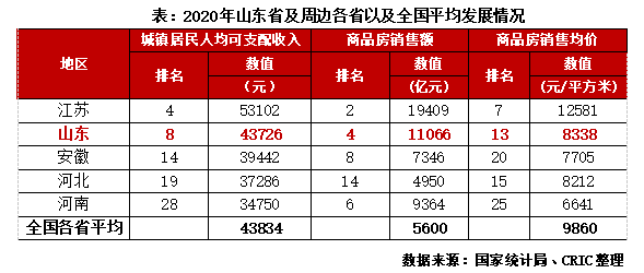 人口支撐購房需求,居民購買力催生購買意愿。山東省作為人口大省,商品房市場購房需求大,2020年全省商品房銷售總額約1.11萬億元,占全國商品房銷售額的6.4%,排名第四。城鎮(zhèn)居民人均可支配收入為43726元,略低于全國平均,但高于周邊除江蘇外的其他省份。就居民購買力來看,商品房均價可承受度高,一定程度上能加強居民購買意愿,促進房地產市場進一步發(fā)展。