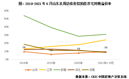 溢價率低于周邊省份,土拍市場相對平靜。據CRIC監(jiān)測,2018至2021年6月,山東省涉宅招拍掛用地的溢價率維持在6%-9%之間,與周邊省份相比,處于較為健康水平。2021年,在雙集中供地新政下,濟南和青島兩市在5月完成了首批集中供地的出讓,市場熱度較低,分別有63%和98%的土地以底價出讓,其中青島的平均溢價率僅2%。