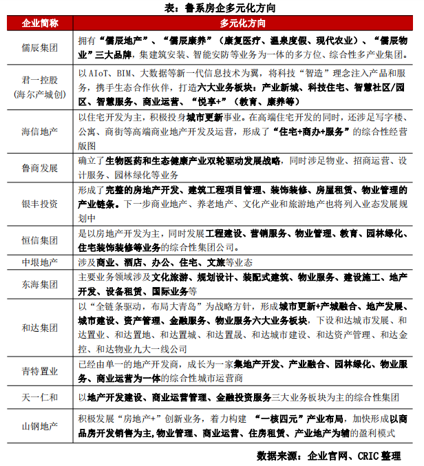 12家企業(yè)明確多元化方向,涉及范圍廣。從17家重點監(jiān)測的魯系房企來看,共有12家明確了多元戰(zhàn)略,其中多數本身為企業(yè)集團,地產部分只是集團多元化板塊之一。比如,除地產開發(fā)外,儒辰集團還擁有康養(yǎng)、物業(yè)兩大板塊,此外還有建筑安裝和智能安防等綜合業(yè)務。君一控股(海爾產城創(chuàng))、魯商發(fā)展、銀豐投資、恒信集團等作為企業(yè)集團,也至少擁有3個多元業(yè)務方向,值得一提的是,為完善地產開發(fā)上下游產業(yè)鏈,多數企業(yè)涉及了物業(yè)管理、裝飾設計等“地產+”業(yè)務。然而,也有房企涉足的部分多元業(yè)務與地產開發(fā)領域關系不大,比如魯商發(fā)展涉及化妝品和藥品生產銷售、恒信集團發(fā)展教育業(yè)務、和達集團把資產管理和金融服務納入主要業(yè)務板塊。