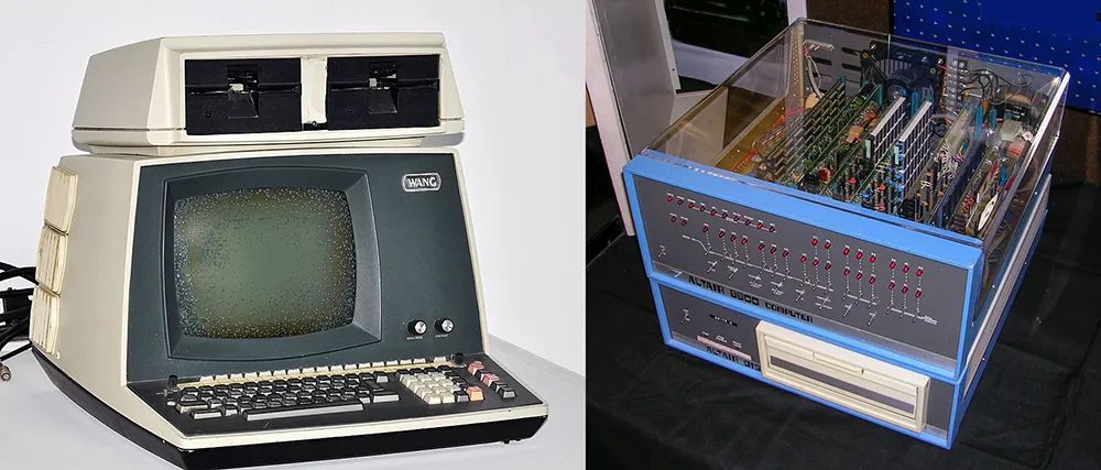 ▼ 左圖為王安電腦面向企業的2200型,右圖為各類硬件拼湊的「牛郎星8800」,是個人電腦的標志起點之一。諷刺的是牛郎星8800誕生于麻省理工,來自哈佛的比爾·蓋茨在此基礎上開發操作系統,而個人電腦的浪潮卻發生在硅谷(來源:Wikipedia)