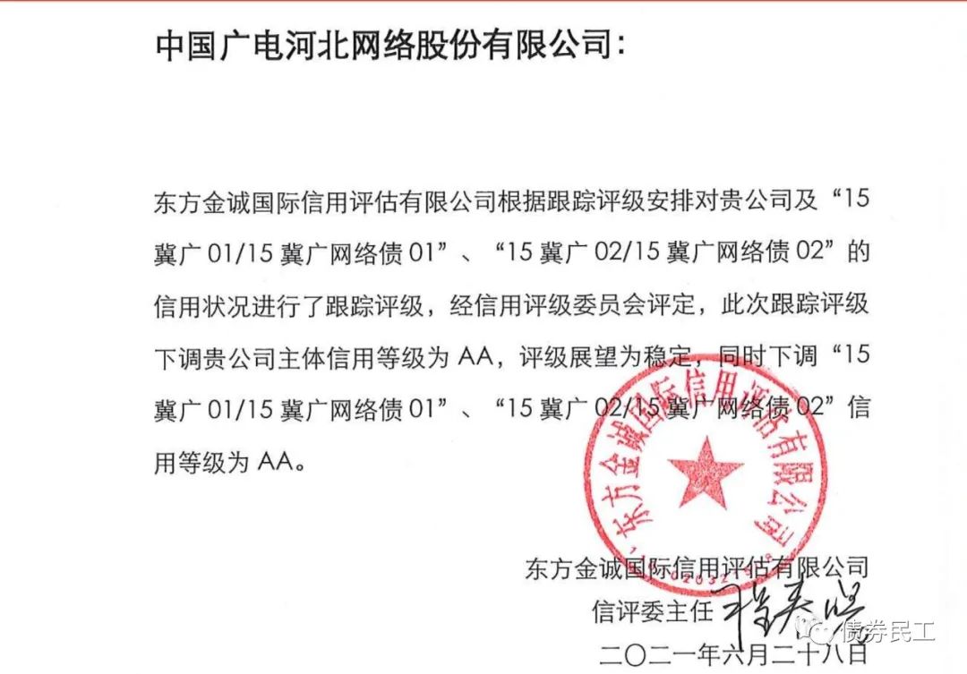 中國廣電河北網絡股份有限公司(以下簡稱“河北廣電”)的主體信用評級由AA+下調至AA。本次主體評級下調的主要原因是營業收入減少、應收金額較高、短期內償債壓力較大等。河北廣電已經完成了工商變更,目前的控股股東是中國廣電網絡股份有限公司,實際控制人是國務院。