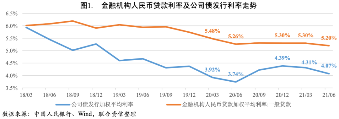 2021年上半年,貨幣政策基本回歸常態(tài),信貸力度總體穩(wěn)固,貸款利率穩(wěn)中有降,公司債發(fā)行利率呈下行趨勢,但仍明顯高于上年同期。二季度公司債發(fā)行加權(quán)平均利率明顯下降,可能是由于一季度信用風(fēng)險事件增多,導(dǎo)致市場風(fēng)險偏好降低,高級別發(fā)行人占比提高,從而拉低了平均利率。