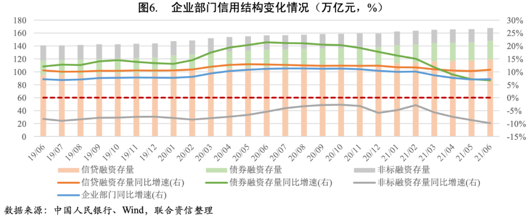 企業(yè)部門信用結(jié)構(gòu)進一步分化。在上年同期高基數(shù)影響下,截至2021年6月末,企業(yè)部門信貸融資、債券融資以及非標(biāo)融資存量同比增速均有所下降。信貸融資基本保持平穩(wěn)增長,同比增速小幅下降1.58個百分點至10.78%。2021年上半年非金融企業(yè)部門新增人民幣貸款8.37萬億元,為僅次于上年同期的歷史較高值。從結(jié)構(gòu)來看,中長期貸款仍是主導(dǎo)地位,新增6.62萬億元,創(chuàng)歷史新高,反映出企業(yè)資本開支需求旺盛;新增短期貸款與票據(jù)融資同比少增,反映出企業(yè)流動性管理訴求趨于正常。債券融資下降明顯,同比增速大幅下降10.98個百分點至6.72%。上半年新增債券融資規(guī)模不及上年同期的一半,除上年高基數(shù)影響之外,上半年企業(yè)債券發(fā)行利率較上年同期顯著升高、4月底出臺政策加強公司債信息披露要求和限制發(fā)行規(guī)模以及募集用途等因素可能也對企業(yè)發(fā)債產(chǎn)生一定抑制作用。非標(biāo)融資持續(xù)壓降,同比增速進一步下降3.96個百分點至-9.84%。上半年非標(biāo)融資規(guī)模收縮8437億元,同比多減8698億元。