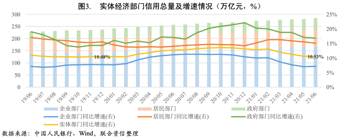 2021年上半年我國實體經(jīng)濟部門信用擴張整體呈現(xiàn)放緩的趨勢。截至2021年6月末,我國實體經(jīng)濟部門信用總量達到284.03萬億元[2],較上年末凈增15.72萬億元;同比增長10.53%,增幅較上年末回落2.63個百分點,基本下降至疫情前的水平。