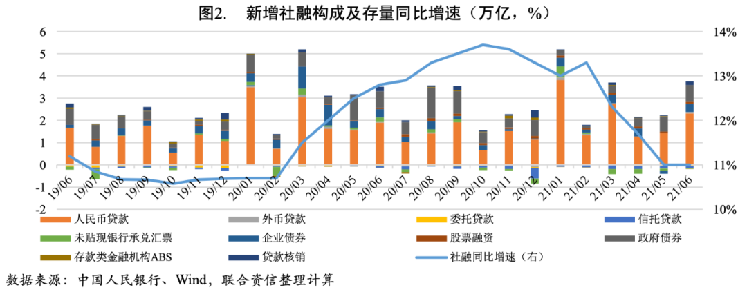 2021年上半年,社融存量同比增速整體呈下行趨勢。截至6月末,社會融資規(guī)模存量達到301.56萬億元,同比增速較上年末下降2.30個百分點至11.00%。上半年新增社融17.74萬億元,雖同比少增3.09萬億元,但卻是僅次于上年的歷史同期較高值,反映出上半年實體經(jīng)濟融資需求較為旺盛。