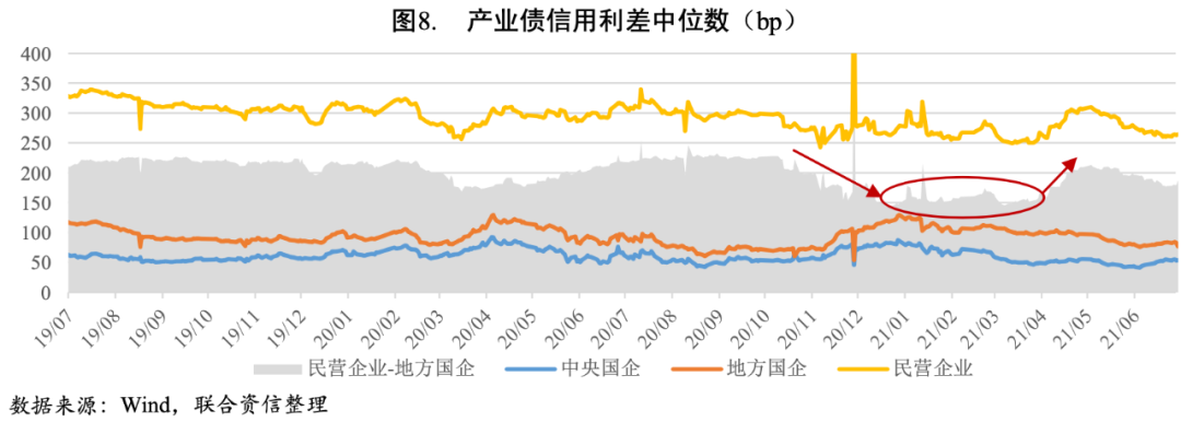 2021年上半年,債券市場新增違約主體18家,到期違約金額合計約778.97億元,較上年同期有所上升,債券市場信用風(fēng)險繼續(xù)釋放。從信用利差來看,在上年四季度連續(xù)發(fā)生大型國企的違約事件后,地方國企的產(chǎn)業(yè)債信用利差迅速走高,與民營企業(yè)產(chǎn)業(yè)債信用利差之差(圖8中灰色部分)縮窄近80bp,今年一季度仍保持在較低的150bp左右,與一季度國企違約事件頻發(fā)[4]相印證,高杠桿、弱資質(zhì)國企信用風(fēng)險繼續(xù)暴露;二季度國、民企利差出現(xiàn)分化,民營企業(yè)信用利差上行,地方國企信用利差呈下行趨勢,反映出二季度民企違約數(shù)量有所增加,信用風(fēng)險上升,市場對地方國企的擔(dān)憂情緒有所緩和。