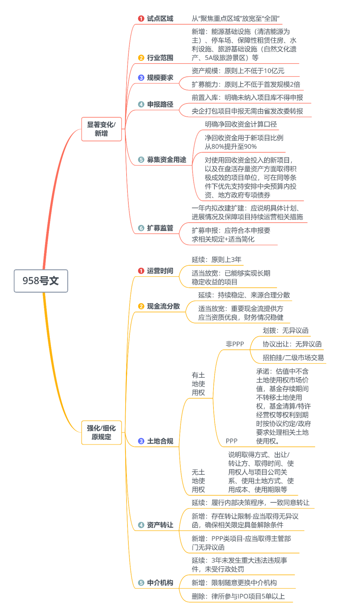首批9支基礎設施REITs試點項目在滬、深兩地交易所掛牌上市已近半月,受到市場高度關注,盡管上市初期流通盤較小,9支基礎設施REITs產品均總體運行表現平穩。2021年7月2日,國家發展改革委(以下簡稱“國家發改委”)公布了《關于進一步做好基礎設施領域不動產投資信托基金(REITs)試點工作的通知》(發改投資[2021]958號,以下簡稱“958號文”),針對此前自2020年8月公布《關于做好基礎設施領域不動產投資信托基金(REITs)試點項目申報工作的通知》(發改辦投資[2020]586號,以下簡稱“586號文”)以來基礎設施REITs試點實操經驗進行總結,從試點區域、基礎資產范圍、募集資金用途要求、資產要求等諸多方面進一步提出指導意見。從內容來看, 958號文相較于586號文,所作修訂可大致分為“顯著變化/新增”、“強化/細化原規定”兩大類(詳見下圖)。