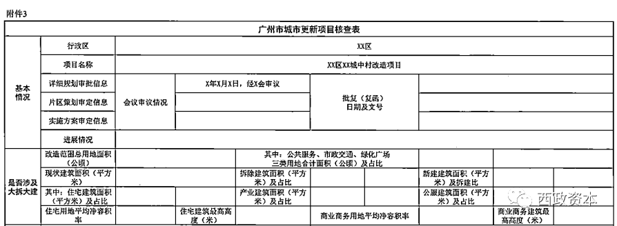 廣州此次發布的《工作方案》中,就大拆大建的指標核查事宜對8月31日住建部發布的《關于在實施城市更新行動中防止大拆大建問題的通知》相關內容進行了實質響應(詳見下文截圖:廣州市城市更新項目核查表)。根據住建部的要求,“原則上城市更新單元(片區)或項目內拆除建筑面積不應大于現狀總建筑面積的20%;原則上城市更新單元(片區)或項目內拆建比不應大于2”。