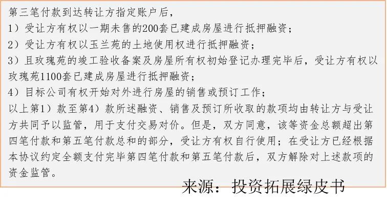 轉(zhuǎn)讓方完成已售房屋所產(chǎn)生的土地增值稅和企業(yè)所得稅清繳;轉(zhuǎn)讓方完成除玉蘭苑外全部工程款項的結(jié)清(直至該等工程完成竣工驗收備案為止)。