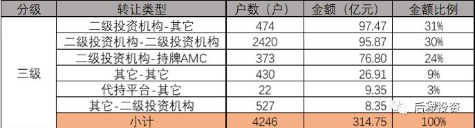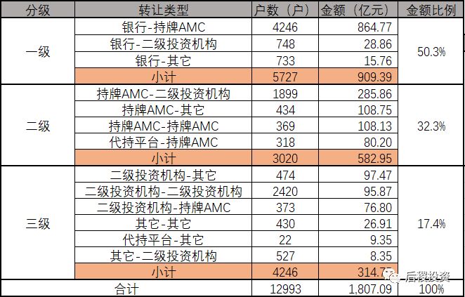 整個第三級市場,參與主體大部分是民營投資機構(個人、企業),數據比較平均。在資產包的整個流轉過程中,有可能出現銀行-持牌AMC、持牌AMC-持牌AMC、持牌AMC-二級投資機構、二級投資機構-其它等多次流轉導致成交金額重復計算的情況 。