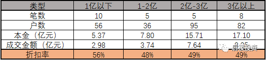 以上成交樣本來源于淘寶18年3戶以上成交記錄。從統計結果來看,本金金額低于1億(小包)整體成交價格要略高于1億以上(大包),整體二級市場成交價在5折左右。以此來看,組大包的方式折扣確實會低。