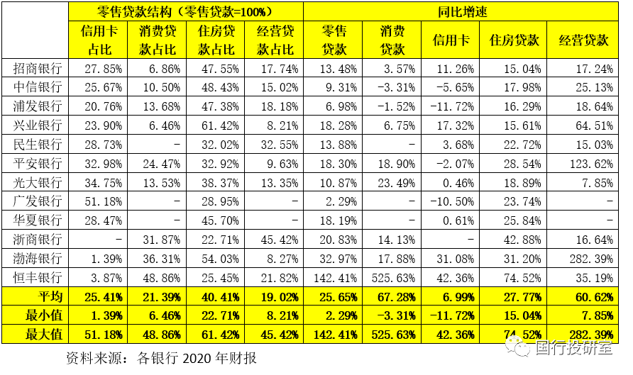 (1)零售貸款可進一步分為信用卡、消費貸款、住房貸款以及經營貸款等四大類,目前股份行零售貸款的25%以上為信用卡透支、40%以上為個人住房按揭貸款、15-20%左右為經營貸款。