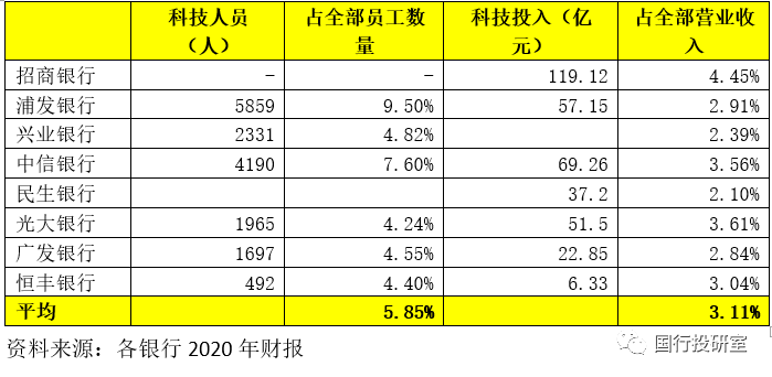 金融科技投入也是股份行之間相互角逐的一個要素,不過從目前的情況來看,除招行投入明顯較多(營業收入的基數較大),大多股份行的科技員工數量占比在6%左右,科技投入占全部營收的比例在3%左右。