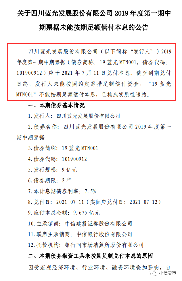 7月12日,藍(lán)光發(fā)展公告稱,截至到期兌付日終,發(fā)行人未能按照約定籌措足額償付資金,“19藍(lán)光MTN001”不能按期足額償付本息,已構(gòu)成實質(zhì)性違約。
